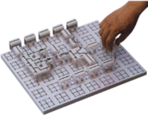 實(shí)驗(yàn)桌一桌兩座,實(shí)驗(yàn)桌中央配有通用九孔萬(wàn)能插件板(尺寸:35×90cm ),九孔萬(wàn)能插件板主體由ABS注塑而成,表面布有九孔成一組相互聯(lián)通的插孔,九孔萬(wàn)能插件板內(nèi)部?jī)?nèi)嵌126組銅質(zhì)九孔一體成型嵌件(共有1134孔)。實(shí)驗(yàn)中的弱電模塊必須以獨(dú)立封裝的透明元件盒為單一模塊,元件盒統(tǒng)一都能配合九孔萬(wàn)能插件板像搭積木一樣的形式自由搭建組合電路;元件盒盒體透明,內(nèi)裝元件直觀性好,盒蓋印刷電路圖防刮耐磨,符號(hào)美觀清晰。元件盒盒體與盒蓋采用較科學(xué)的壓卡式結(jié)構(gòu),維修拆裝方便。每張臺(tái)桌配有一粒膠皮板,保護(hù)通用底板與桌面(如需在桌上放置電動(dòng)機(jī)、焊接等)。