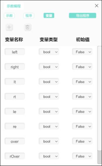 (3)變量頁面:機器人的變量面板,可對程序中的變量進(jìn)行添加與修改。點擊“+”可對變量進(jìn)行添加,點擊“刪除”可對選中變量進(jìn)行刪除。變量類型有int(整數(shù)類型)、float(浮點數(shù)類型)、bool(布爾類型)、string(字符串類型)四種類型。同時可對變量名稱進(jìn)行編輯,對變量類型進(jìn)行選擇,對初始值進(jìn)行手動輸入。