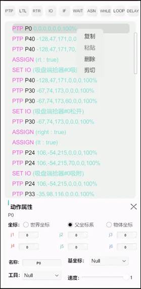 (2)程序頁面:機器人的程序面板包含:子程序列表、機器人的快捷指令,程序編輯面板以及相應(yīng)的動作屬性。子程序為用戶提供了一種整理程序的方式,可進(jìn)行創(chuàng)建、復(fù)制和刪除的操作,同時“CALL”語句可以實現(xiàn)對子程序的調(diào)用。在程序編輯面板中可對指令進(jìn)行增刪改查操作,如下圖所示可進(jìn)行程序的復(fù)制、粘貼、刪除、剪切操作,可通過按住某一行程序進(jìn)行上下移的,來完成對程序面板上的程序進(jìn)行調(diào)整順序的操作。