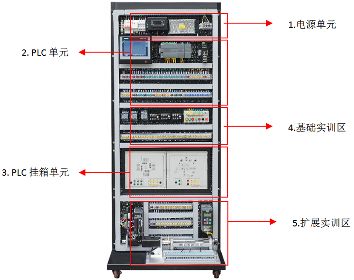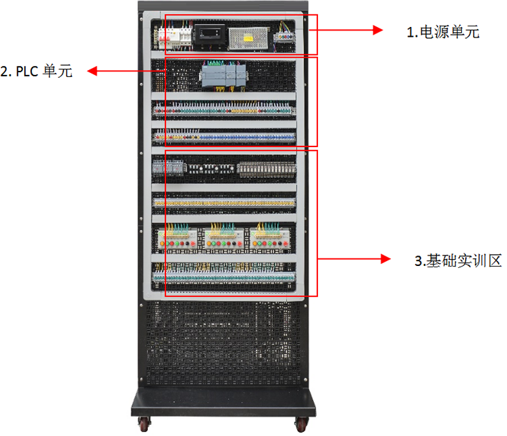 實訓單元組成:網(wǎng)孔板實訓區(qū)主要由電源單元、PLC單元、PLC學習箱單元、基礎(chǔ)實訓單元、小車運動單元、變頻器單元等組成。