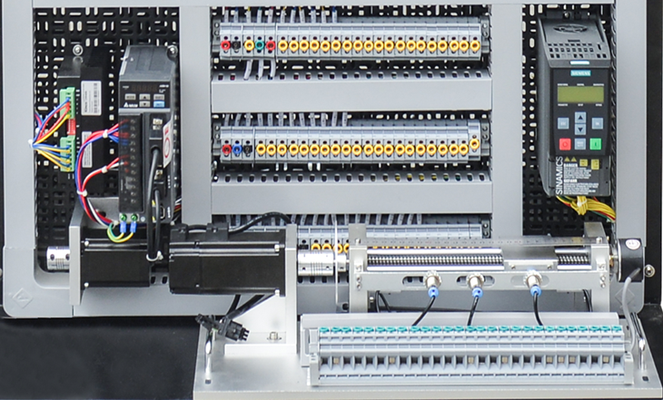 組成:伺服系統(tǒng)、步進系統(tǒng)、變頻系統(tǒng)、小車運動模塊、三相異步電動機模塊;