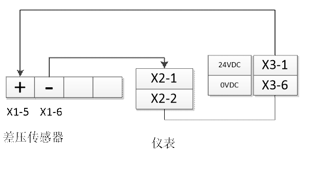 具體的接線:將X3接線端子排上的“24V+”接到X1差壓變送器的“+”,差壓變送器的“-”接到X2儀表信號采集端子“+”,信號采集端子“-”接到“24V-”端。