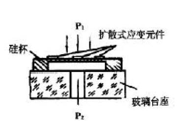 丈量敏感元件為周邊固支的硅杯,在此杯單晶硅膜片的上下兩側出現(xiàn)壓差時膜片內部孕育發(fā)生應力。在壓力P1、P2 作用下電橋出現(xiàn)不均衡,輸出一個正比于壓力變革的電壓信號。