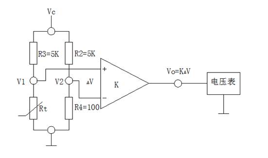 圖中△V=V1-V2;V1=[Rt/(R3+Rt)]Vc;V2=[R4/(R4+R2)]Vc;