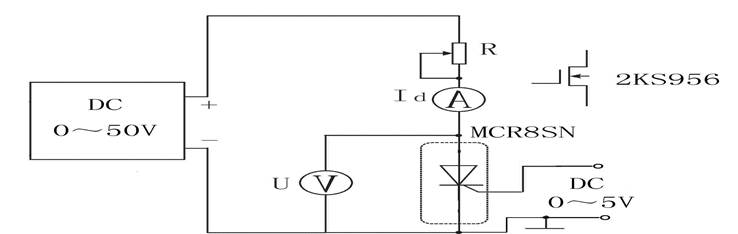 首先將絕緣柵型場效應管(2KS956)接入主電路,主電路直流0~50V電源用屏上直流電樞電源,控制回路電源用0~30V直流可調(diào)穩(wěn)壓電源,把30V可調(diào)穩(wěn)壓電源電位器沿逆時針旋到底, 電位器選元器件測試箱上的1K\2W的電位器;電流表選用控制屏上20mA~2000mA的直流檔,直流電壓表選用100V的電壓檔