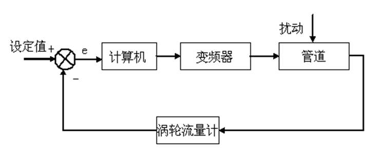 根據(jù)設(shè)定的流量輸給計算機,用計算機的輸出來控制變頻器,用流量計測出流量信號反饋給計算機,由計算機進行比較和運算輸出給變頻器,從而最終達到管內(nèi)流量的平衡。
