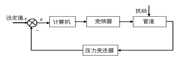 本實驗采用計算機控制,將壓力控制在設(shè)定值。將壓力信號輸出給計算機,計算機根據(jù)P、I、D參數(shù)進行PID運算,輸出信號給變頻器,然后由變頻器控制供水系統(tǒng)的進水壓力,從而達到控制設(shè)定壓力基本恒定的目的。壓力控制的方塊原理圖如下:
