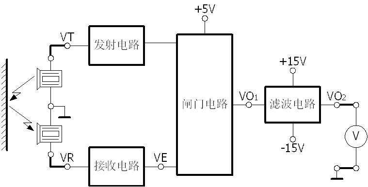 超聲波發(fā)射傳感器、超聲波接收傳感器、超聲波傳感器轉(zhuǎn)換電路板、反射擋板、直流穩(wěn)壓電源、數(shù)字電壓表