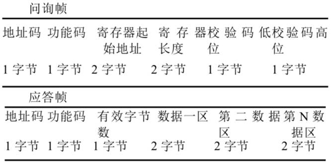問詢幀:| 地址碼 | 功能碼 | 起始地址 | 數(shù)據(jù)長度 | 校驗碼低位 | 校驗碼高位 |