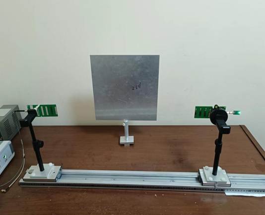 3、 移動(dòng)反射板,如圖所示,將接收八木天線安裝到支架上對(duì)準(zhǔn)反射波來波方向,注意與反射電場(chǎng)極化匹配。