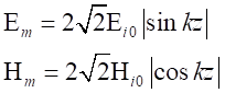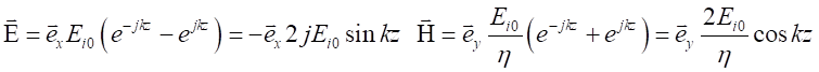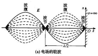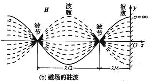 由上式可以看到,z≤0空間中的合成波具有如下特點(diǎn)電場(chǎng)強(qiáng)度和磁場(chǎng)強(qiáng)度的振幅不再是常量,沿波的傳播方向按正弦函數(shù)或余弦函數(shù)分布,即在kz=-np,也就的點(diǎn)上,電場(chǎng)強(qiáng)度的振幅為零。這些點(diǎn)稱為電場(chǎng)強(qiáng)度的波節(jié)點(diǎn)。在也就是的點(diǎn)上,電場(chǎng)強(qiáng)度的振幅值達(dá)到最大值2Ei0,它是入射波電場(chǎng)強(qiáng)度振幅值Ei0的2倍,這些點(diǎn)稱為電場(chǎng)強(qiáng)度的波腹點(diǎn)。在這些點(diǎn)上,磁場(chǎng)強(qiáng)度的振幅為零。這些點(diǎn)是磁場(chǎng)強(qiáng)度的波節(jié)點(diǎn)。在其它點(diǎn)上,電場(chǎng)和磁場(chǎng)的振幅介于零和最大值2Ei0或2Ei0/h之間。相鄰的兩個(gè)波節(jié)點(diǎn)或波腹點(diǎn)之間的距離是半個(gè)波長(zhǎng);而相鄰的波腹點(diǎn)和波節(jié)點(diǎn)之間的距離是1/4波長(zhǎng)。電場(chǎng)強(qiáng)度和磁場(chǎng)強(qiáng)度的波節(jié)點(diǎn)和波腹點(diǎn)之間的距離是1/4波長(zhǎng)。電場(chǎng)強(qiáng)度和磁場(chǎng)強(qiáng)度的波節(jié)點(diǎn)和波腹點(diǎn)的位置不隨時(shí)間改變。