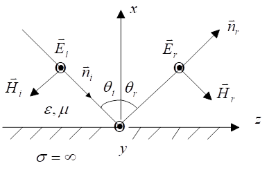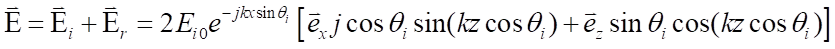 電磁波不能進(jìn)入理想導(dǎo)體,所以在理想導(dǎo)電平面上,入射的電磁波必然會(huì)被反射。反射波與入射波在相反的方向上傳播,設(shè)反射波的電場(chǎng)強(qiáng)度為反射波的磁場(chǎng)強(qiáng)度為 ,在中z≤0的空間中的電磁波是入射波和反射波的迭加,總的電場(chǎng)強(qiáng)度為