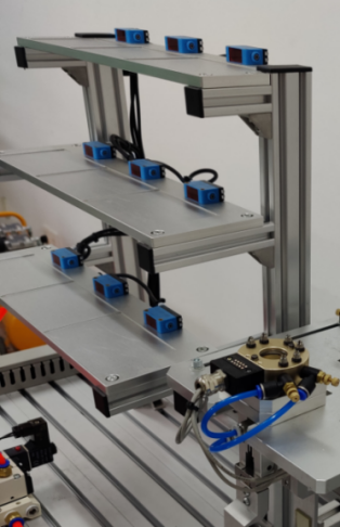3、立體倉庫:存儲自動裝配工件;倉位數(shù)量:≥3列3層9個;倉位承重:≥2Kg;倉位尺寸:≥100mm×70mm×80mm;外形尺寸:≥350mm×180mm×450mm;工件種類:≥3種9個;工件模塊包括自動裝配母件、子件等。