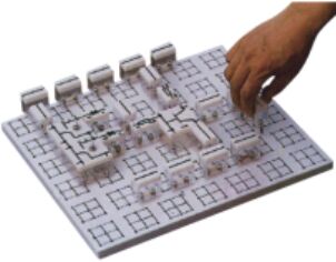 實(shí)驗(yàn)桌一桌兩座,實(shí)驗(yàn)桌中央配有通用九孔萬能插件板(尺寸:35×90cm ),九孔萬能插件板主體由ABS注塑而成,表面布有九孔成一組相互聯(lián)通的插孔,九孔萬能插件板內(nèi)部?jī)?nèi)嵌126組銅質(zhì)九孔一體成型嵌件(共有1134孔)。實(shí)驗(yàn)中的弱電模塊必須以獨(dú)立封裝的透明元件盒為單一模塊,元件盒統(tǒng)一都能配合九孔萬能插件板像搭積木一樣的形式自由搭建組合電路;元件盒盒體透明,內(nèi)裝元件直觀性好,盒蓋印刷電路圖防刮耐磨,符號(hào)美觀清晰。元件盒盒體與盒蓋采用較科學(xué)的壓卡式結(jié)構(gòu),維修拆裝方便。每張臺(tái)桌配有一粒膠皮板,保護(hù)通用底板與桌面(如需在桌上放置電動(dòng)機(jī)、焊接等)。