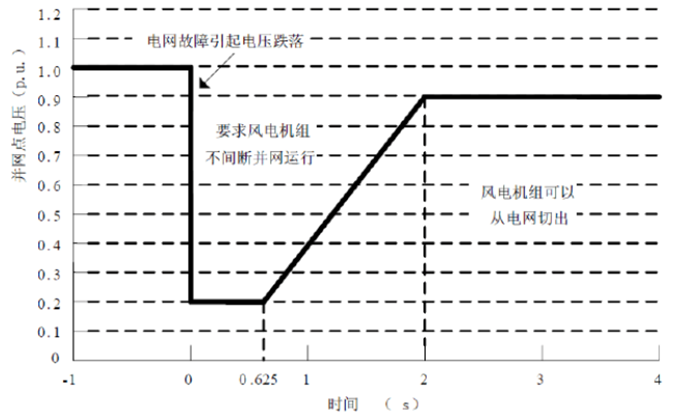 并網(wǎng)點電壓跌至20%額定電壓時,保證不脫網(wǎng)連續(xù)運行625ms ;