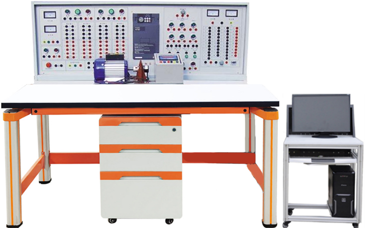 實(shí)訓(xùn)裝置由控制屏、實(shí)訓(xùn)桌、變頻實(shí)訓(xùn)組件、繼電接觸實(shí)訓(xùn)組件、數(shù)字量/模擬量輸入輸出給定指示組件、三相異步電機(jī)、電機(jī)導(dǎo)軌、測(cè)速機(jī)構(gòu)等組成。