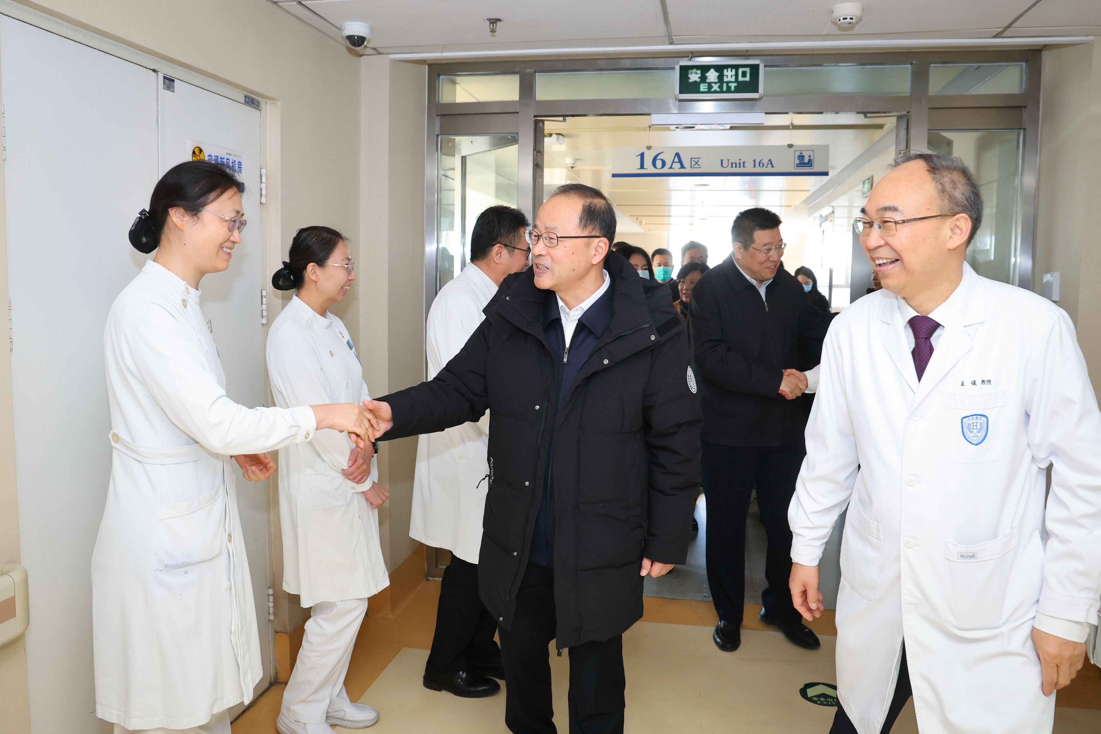 校長(zhǎng)龔旗煌一行前往校醫(yī)院,在住院樓一層向堅(jiān)守崗位的醫(yī)護(hù)人員致以節(jié)日問候,在二層探望了學(xué)校原常務(wù)副校長(zhǎng)王義遒老師,詳細(xì)詢問了他的健康狀況與生活近況;在第二教學(xué)樓巡視期末考場(chǎng)并前往主控室慰問工作人員;在醫(yī)學(xué)部學(xué)生公寓1號(hào)樓,看望在校學(xué)生與駐樓輔導(dǎo)員,乘車前往躍進(jìn)廳學(xué)生食堂,慰問食堂工作人員代表;在腫瘤醫(yī)院走訪淋巴腫瘤內(nèi)科與胃腸腫瘤中心二病區(qū),慰問臨床一線醫(yī)護(hù)人員。