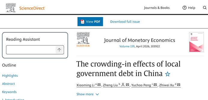 近期,金融學(xué)院教授彭俞超與對(duì)外經(jīng)濟(jì)貿(mào)易大學(xué)李曉明、舊金山聯(lián)邦儲(chǔ)備銀行Zheng Liu、復(fù)旦大學(xué)許志偉合作撰寫的論文The crowding-in effects of local government debt in China(中國(guó)地方政府債務(wù)的擠入效應(yīng))在貨幣經(jīng)濟(jì)學(xué)國(guó)際頂級(jí)期刊Journal of Monetary Economics正式發(fā)表。