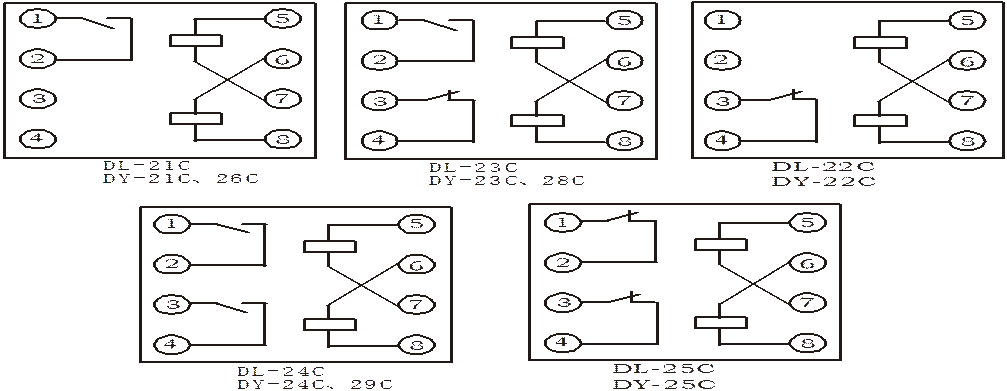 DL—20c、DY—20c系列繼電器的內(nèi)部接線圖見圖1一1。