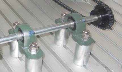 F、  用鏈條試著選擇合適的位置,用長(zhǎng)T型螺釘、墊圈、螺母固定四個(gè)軸承支架和安裝兩個(gè)軸承;