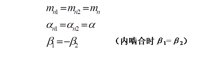 一對(duì)外嚙合斜齒圓柱齒輪的正確嚙合條件是:齒輪副的法面模數(shù)和法面壓力角分別相等,而且螺旋角大小相等,旋向相反,即