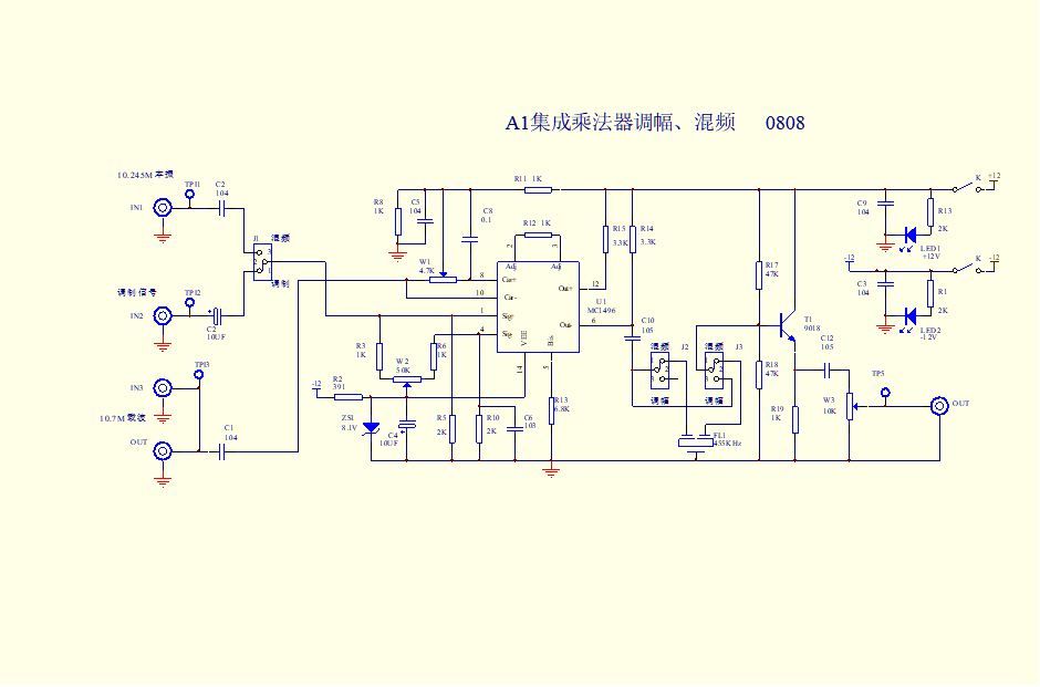 當(dāng)進行集成乘法器混頻實驗時,把J2、J3、J5、J8、J9上的跳線塊置于1-2位置,將J1上的跳線塊改插于2-3位置,(J4、J6、J7不插跳塊);IN1、IN3分別輸入10.245 MHz與10.7MHz高頻正弦波,IN2空閑。