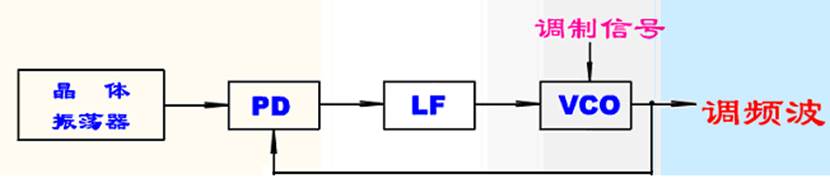 實現(xiàn)鎖相調(diào)頻的條件是調(diào)制信號的頻譜要處于低通濾波器通帶之外。使壓控振蕩器的中心頻率鎖定在穩(wěn)定度很高的晶振頻率上,而隨著輸入調(diào)制信號的變化,振蕩頻率可以發(fā)生很大偏移。這種鎖相環(huán)路稱載波跟蹤型PLL。