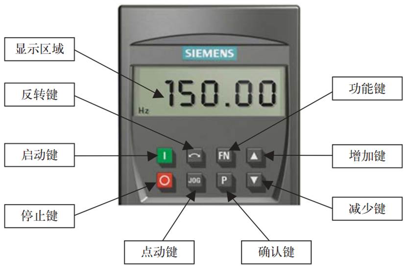 利用變頻器的操作面板和相關(guān)參數(shù)設(shè)置,即可實(shí)現(xiàn)對(duì)變頻器的某些基本操作如正反轉(zhuǎn)、點(diǎn)動(dòng)等運(yùn)行。變頻器面板的介紹及按鍵功能說明如下圖,具體參數(shù)號(hào)和相應(yīng)功能參照系統(tǒng)手冊。