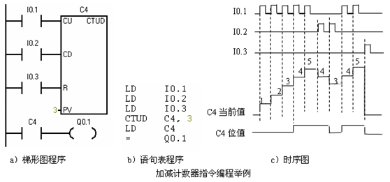 CTUD Cxxx,PV 在加計數(shù)脈沖輸入CU的上升沿,計數(shù)器的當前值加1,在減計數(shù)脈沖輸入CD的上升沿,計數(shù)器的當前值減1,當前值大于等于設(shè)定值PV時,計數(shù)器位被置位。若復位輸入R為ON時或?qū)τ嫈?shù)器執(zhí)行復位指令R時,計數(shù)器被復位