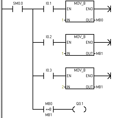 實(shí)驗(yàn)步驟,將上圖所示程序下載至PLC中,分別接通I0.1,I0.2,I0.3觀察輸出Q0.1變化