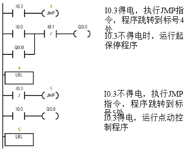 設(shè)I0.3為點(diǎn)動(dòng)/連動(dòng)控制選擇開關(guān),當(dāng)I0.3得電時(shí),選擇點(diǎn)動(dòng)控制;當(dāng)I0.3不得電時(shí),選擇連續(xù)運(yùn)行控制。采用跳轉(zhuǎn)指令控制的點(diǎn)動(dòng)/連動(dòng)控制程序如下圖所示
