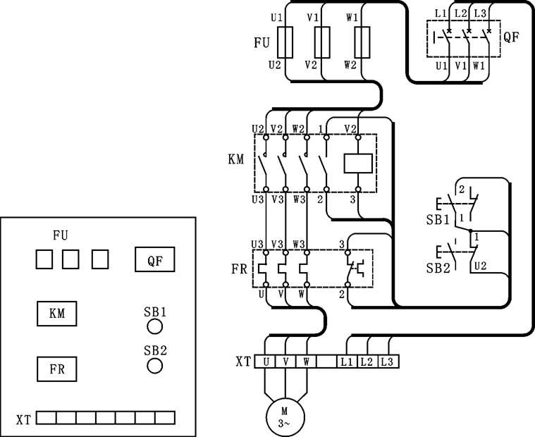 接線時(shí)動(dòng)力電路用黑色線,控制電路用紅色線;啟動(dòng)按鈕SB1用綠色,停止按鈕SB2用紅色。安裝接線后應(yīng)符合第二章的要求。