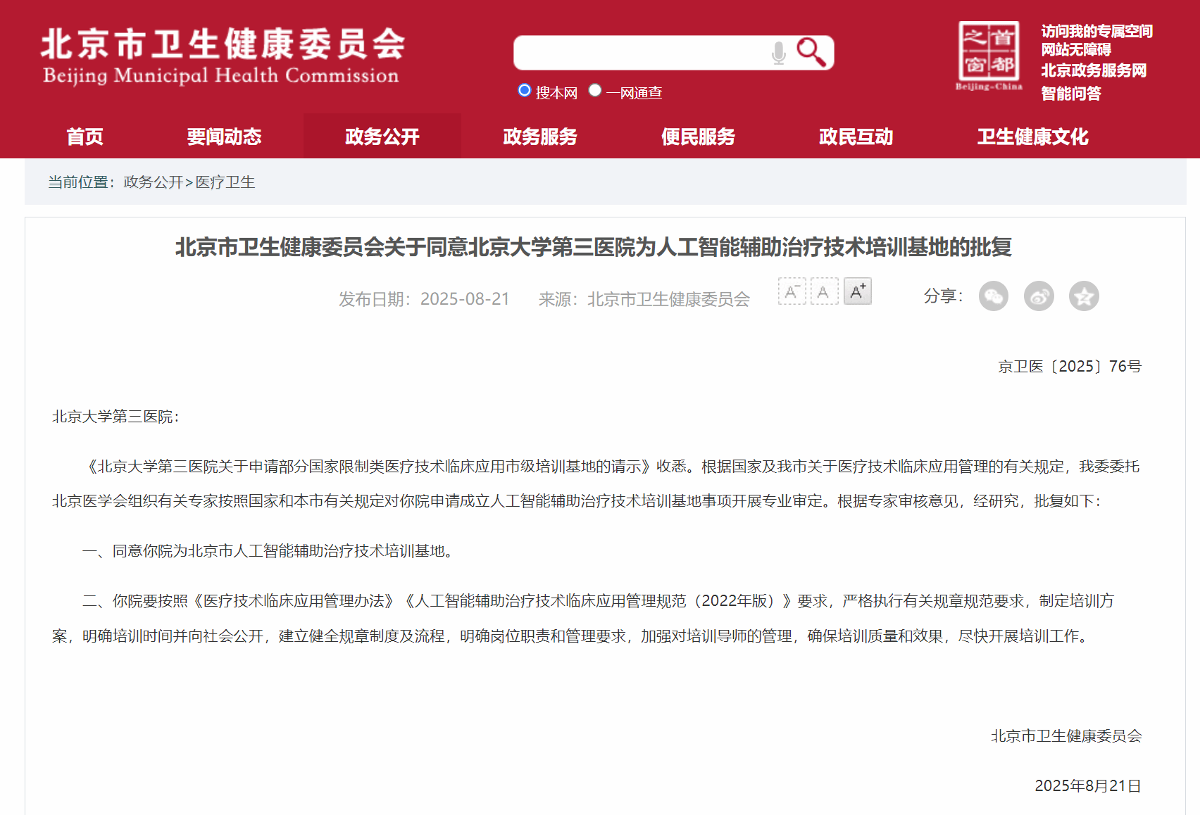2025年8月21日,北京市衛(wèi)生健康委正式批復(fù),同意北京大學(xué)第三醫(yī)院為北京市人工智能輔助治療技術(shù)培訓(xùn)基地。該基地的獲批標(biāo)志著北京大學(xué)第三醫(yī)院在智能外科領(lǐng)域的技術(shù)實(shí)力與教學(xué)能力獲得認(rèn)可,將為北京市乃至全國培養(yǎng)高素質(zhì)的醫(yī)療人工智能應(yīng)用人才提供重要平臺。