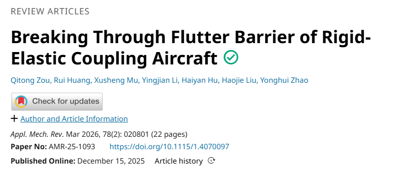 近日,由胡海巖院士、黃銳教授領(lǐng)導(dǎo)的團隊在飛翼布局飛行器的剛-彈耦合顫振抑制技術(shù)研究方面取得突破。飛行試驗表明,該團隊成功實現(xiàn)結(jié)構(gòu)強度極限內(nèi)的剛-彈耦合顫振屏障突破,將安全飛行速度提高62.5%,創(chuàng)造了該領(lǐng)域的世界記錄。相關(guān)研究成果以“Breaking Through Flutter Barrier of Rigid-Elastic Coupling Aircraft”為題發(fā)表于力學領(lǐng)域頂刊《ASME Applied Mechanics Reviews》(影響因子:16.1)。論文第一作者為我校航空學院博士生鄒奇彤,通訊作者為南京航空航天大學黃銳教授和北京理工大學胡海巖院士,航空航天結(jié)構(gòu)力學及控制全國重點實驗室為論文第一完成單位。該研究工作獲得國家自然科學基金委員會優(yōu)秀青年科學基金、國家自然科學基金青年基金A類項目資助,是近20年來我國動力學與控制領(lǐng)域?qū)W者在該期刊發(fā)表的唯一論文。