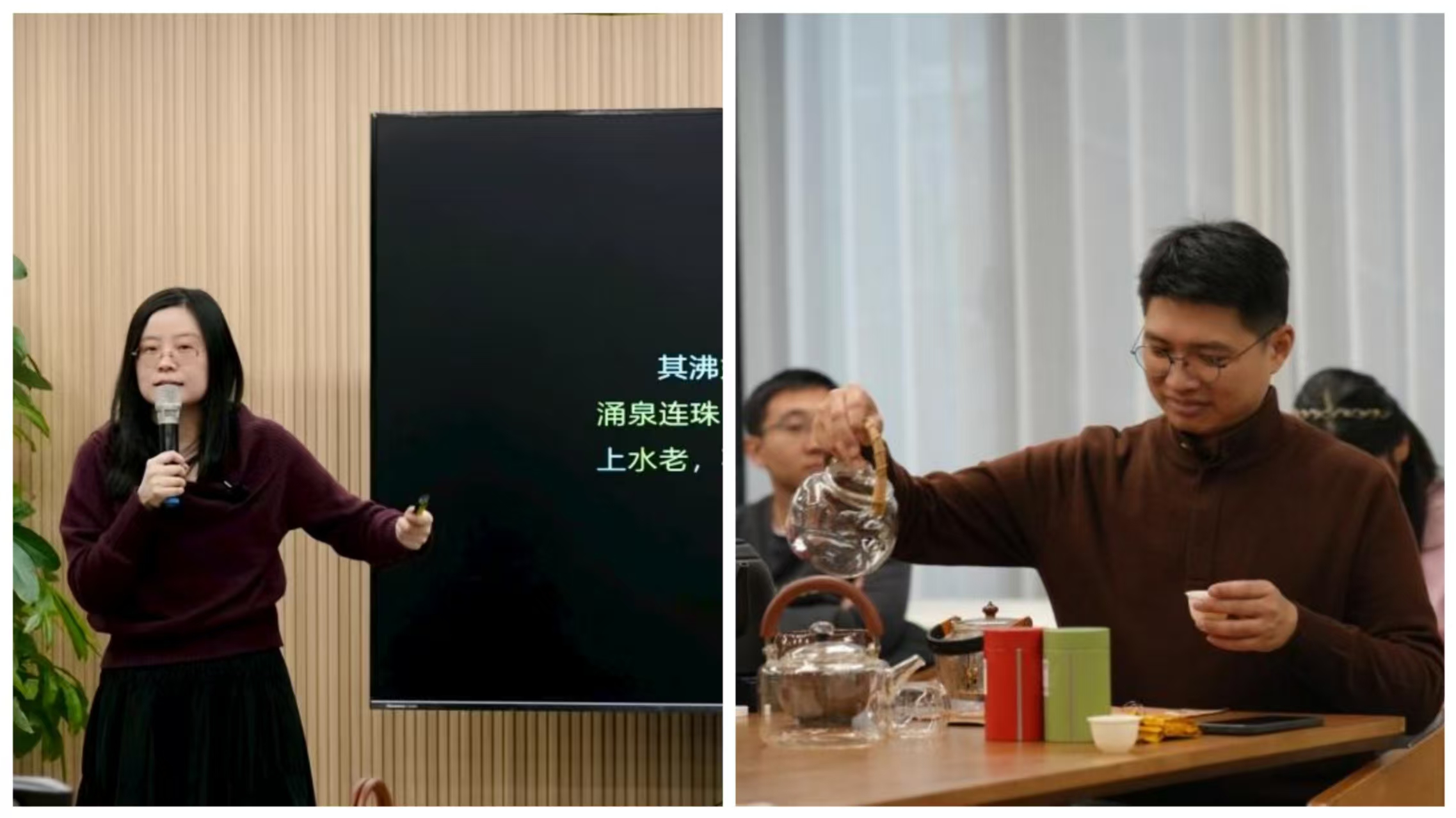 徐千懿以“湯者,茶之司命”為引,圍繞“水如何成就一泡好茶”核心主題,從茶科技史與文化史視角,系統(tǒng)梳理燒水、煎水與用水觀念的千年演變。講授期間,陳重穆同步開展泡茶實踐演示,通過繞注、降溫、控沸等操作,將文獻(xiàn)中的“湯法”轉(zhuǎn)化為可感知、可理解的現(xiàn)場體驗,使抽象的歷史概念與當(dāng)代飲茶實踐形成直觀對應(yīng)。