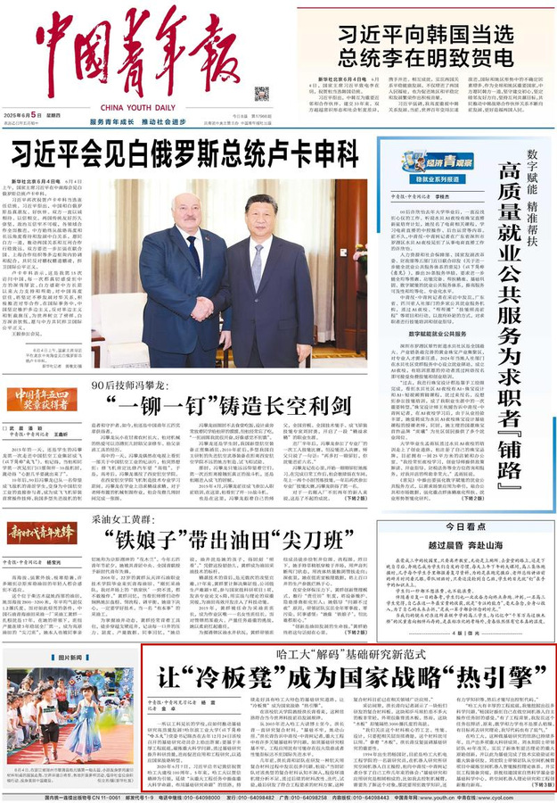 2025-06-06 07:066月5日,《中國青年報》頭版以《哈工大“解碼”基礎(chǔ)研究新范式 讓“冷板凳”成為國家戰(zhàn)略“熱引擎”》為題,聚焦近年來我校堅持以習近平總書記賀信精神為引領(lǐng),持續(xù)走好具有哈工大特色的基礎(chǔ)研究道路,讓“冷板凳”成為國家戰(zhàn)略“熱引擎”。