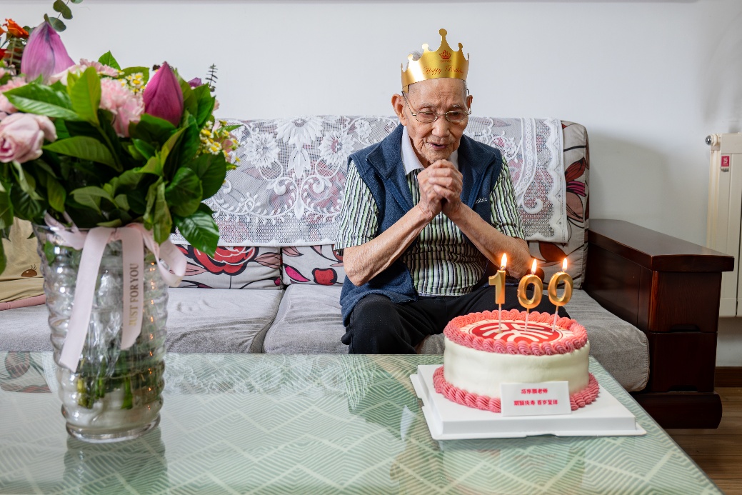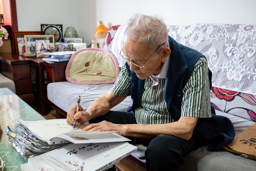這位精神矍鑠的期頤老人,至今仍堅(jiān)持獨(dú)居自理。每當(dāng)吟誦起自己創(chuàng)作的詩(shī)篇,讀至情動(dòng)處,他那洪亮的聲音總能讓人不自覺(jué)感染熱忱的力量。