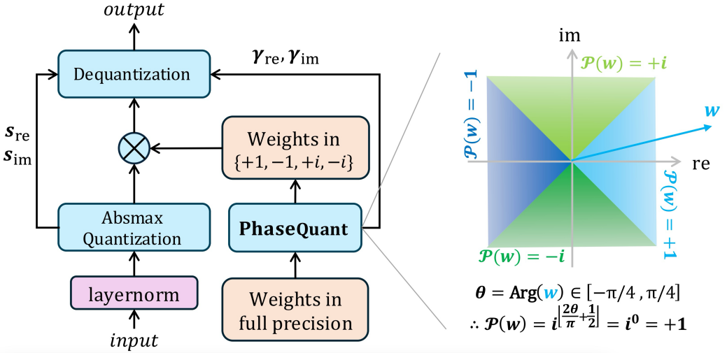 研究聚焦于大語(yǔ)言模型在真實(shí)應(yīng)用中的空間和時(shí)間瓶頸。傳統(tǒng)全精度模型參數(shù)量大、推理能耗高;盡管已有低比特量化降低了模型體積,但核心矩陣乘法仍廣泛依賴乘法運(yùn)算,難以從根本上壓縮推理時(shí)延和能耗。為此,團(tuán)隊(duì)提出在復(fù)數(shù)平面進(jìn)行2-bit量化:通過(guò)相位映射將權(quán)重限定為四個(gè)單位根{+1, −1, +i, −i},在不增加位寬的情況下充分利用2 bit信息容量,同時(shí)保持量化集合的對(duì)稱性和訓(xùn)練穩(wěn)定性。
