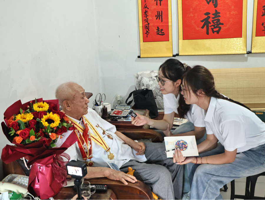 正值中國人民解放軍建軍節(jié)之際,實踐團走訪慰問多名老兵,向為民族解放事業(yè)立下不朽功勛的老兵致以崇高敬意。98歲新四軍老兵王云祥追憶戰(zhàn)場救治傷員的過往經(jīng)歷,講述晚年仍為社會捐款的黨員擔(dān)當(dāng);95歲棗莊武工隊隊員陳貴茂緊握成員雙手,眼中含淚囑托:“你們一定要努力報效祖國!”92歲的于江回憶“鋼鐵運輸線”的烽火歲月,再現(xiàn)彭德懷口中“萬歲軍”的榮光;95歲的王鳳樓高舉戰(zhàn)爭中被炸斷的手指,慨言“斷指不下火線”;90歲的戚忠志以撰寫回憶錄和創(chuàng)作出版?zhèn)人漫畫來定格戰(zhàn)場歲月的記憶,囑托青年“讓國家更加強大”的箴言擲地有聲。