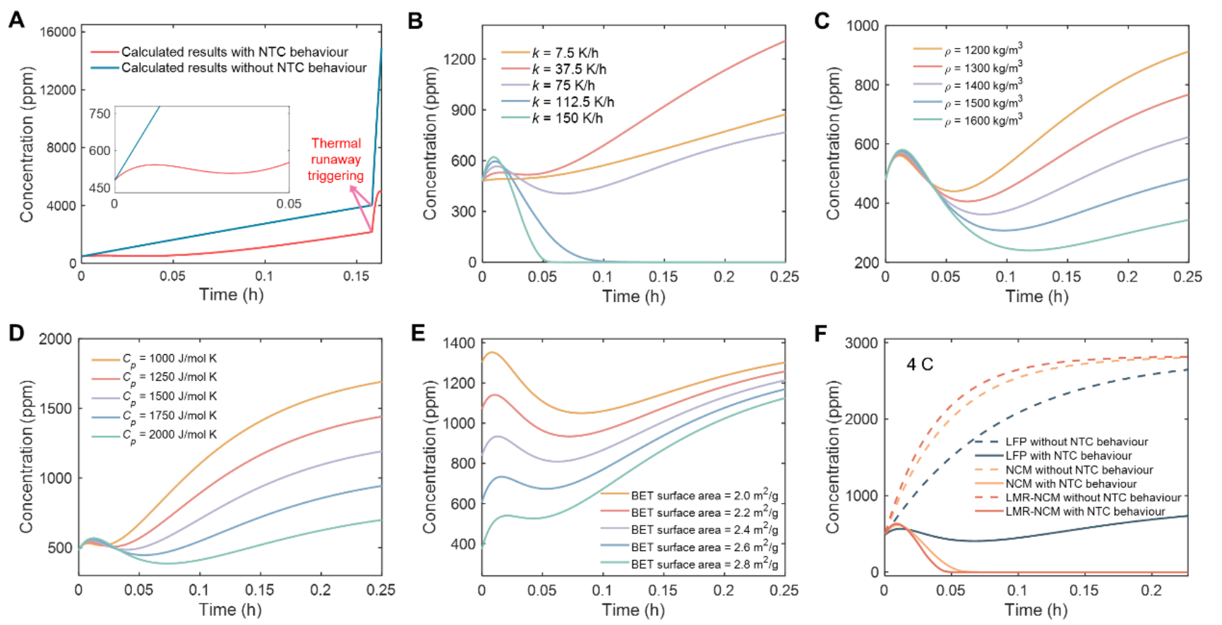 研究闡明了電池?zé)崾Э剡^程中H2演化的特征,并為電池的設(shè)計(jì)與運(yùn)行提供了安全性指導(dǎo)。對于在外部觸發(fā)故障情境下的LFP電池,劇烈的升溫速率可誘發(fā)熱失控。研究預(yù)測,在不考慮NTC行為的情況下,熱失控前后H2的積聚量分別約為具有NTC行為時(shí)的2倍和3倍。這表明增強(qiáng)NTC效應(yīng)有助于降低熱失控引發(fā)燃燒的風(fēng)險(xiǎn),提升電池安全性。該研究進(jìn)一步發(fā)現(xiàn),NTC行為在電池循環(huán)中可通過增強(qiáng)焦耳熱、降低電解液Lewis數(shù)以及提高負(fù)極石墨孔隙率等方式顯著增強(qiáng)(圖5),在此情況下,H2幾乎被局限于負(fù)極區(qū)域,而非進(jìn)入電池中部空腔。這一發(fā)現(xiàn)有望建立新一代智能電池在高倍率條件下的關(guān)鍵安全范式與設(shè)計(jì)策略,例如提高電解液的密度和熱容,采用高孔隙率石墨材料等。此外,該研究還證實(shí),NTC行為對于開發(fā)快充型與高能量密度電池亦具有重要優(yōu)勢。