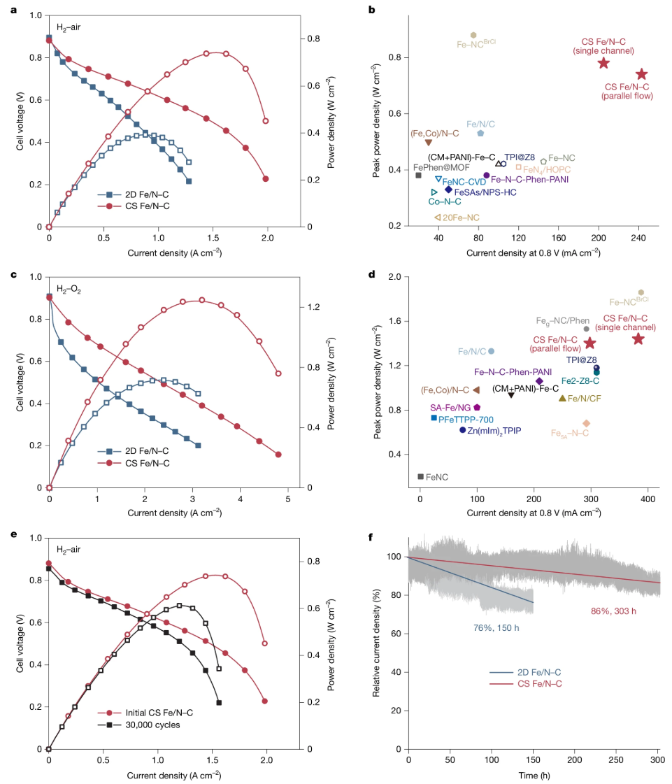 我校向中華教授團(tuán)隊在該突破性研究中負(fù)責(zé)了該新型催化劑在實際質(zhì)子交換膜燃料電池(PEMFC)工況下的器件性能評估、優(yōu)化與穩(wěn)定性提升工作。研究團(tuán)隊通過動態(tài)電-質(zhì)耦合模型分析方法,強化催化層傳質(zhì),使活性中心充分暴露,對CS Fe/N-C催化劑在燃料電池工況下的性能進(jìn)行了系統(tǒng)探索。測試數(shù)據(jù)直接證實了CS Fe/N-C催化劑在真實、嚴(yán)苛的工作環(huán)境下,能夠驅(qū)動電池輸出接近實用化水平的功率密度,顯著優(yōu)于以往報道的大多數(shù)非鉑Fe/N-C催化劑,為未來應(yīng)用于實際燃料電池系統(tǒng)提供了堅實的實驗基礎(chǔ)和性能標(biāo)桿。
