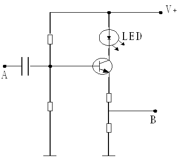 圖6.1(b)所示的是一個簡單的模擬信號直接調(diào)制電路。當(dāng)信號從A點輸入后,晶體管放大器集電極電流就跟隨模擬量而變,亦即發(fā)光電二極管LED的注入電流跟隨模擬信號變化,于是LED的輸出光功率就跟隨模擬量變化,這樣實現(xiàn)了對光源的直接調(diào)制。從放大器工作原理上看,這個晶體管應(yīng)該工作在甲類,在B點可進行監(jiān)測。