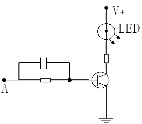 一種簡單的LED數(shù)字信號調(diào)制電路如圖6.2所示,它是只有一級共發(fā)射極的晶體管調(diào)制電路,晶體管用作飽和開關(guān),晶體管的集電極電流就是LED的注入電流。信號由A點接入。“0”碼時晶體三極管不導(dǎo)通;“1”碼時晶體三極管導(dǎo)通,于是注入電流注入到LED管,使得LED管發(fā)光,從而實現(xiàn)了數(shù)字信號調(diào)制。