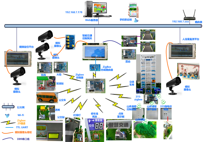 智能交通應(yīng)用實(shí)訓(xùn)系統(tǒng)以城市道路交通為原型,融合了無(wú)線傳感器網(wǎng)絡(luò)、RFID射頻識(shí)別、圖像識(shí)別、無(wú)線通信、云服務(wù)、M2M中間件等物聯(lián)網(wǎng)先進(jìn)技術(shù),依托部署在交通沙盤中的智能車、紅綠燈、公交站、RFID設(shè)備、模擬攝像機(jī)、網(wǎng)絡(luò)攝像機(jī)、Android網(wǎng)關(guān)、圖像服務(wù)器等設(shè)備,實(shí)現(xiàn)智能車、紅綠燈控制、公交站自動(dòng)播報(bào)、路燈控制、智能停車場(chǎng),違章抓拍、車牌識(shí)別、人流量檢測(cè)、公路災(zāi)害智能預(yù)警等功能,為物聯(lián)網(wǎng)專業(yè)教學(xué)提供了一個(gè)完備的應(yīng)用實(shí)訓(xùn)系統(tǒng)。